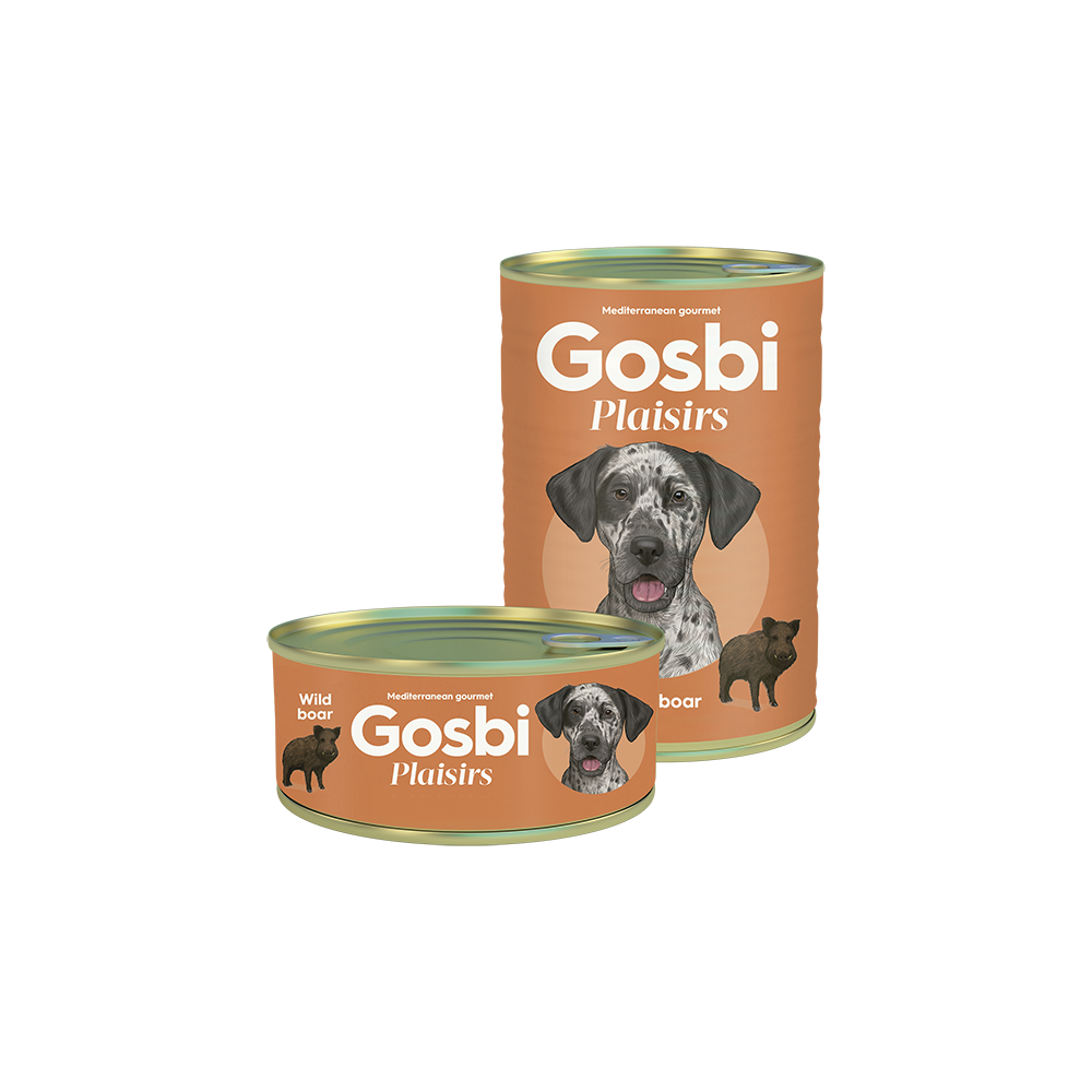 Gosbi PLAISIRS Wild Boar es un alimento complementario húmedo para perros adultos. Receta sabrosa con jabalí (50%) que aporta variedad y estimula el apetito. Ideal para mezclar con pienso o dar como topping ocasional. Formatos 185 g y 400 g.