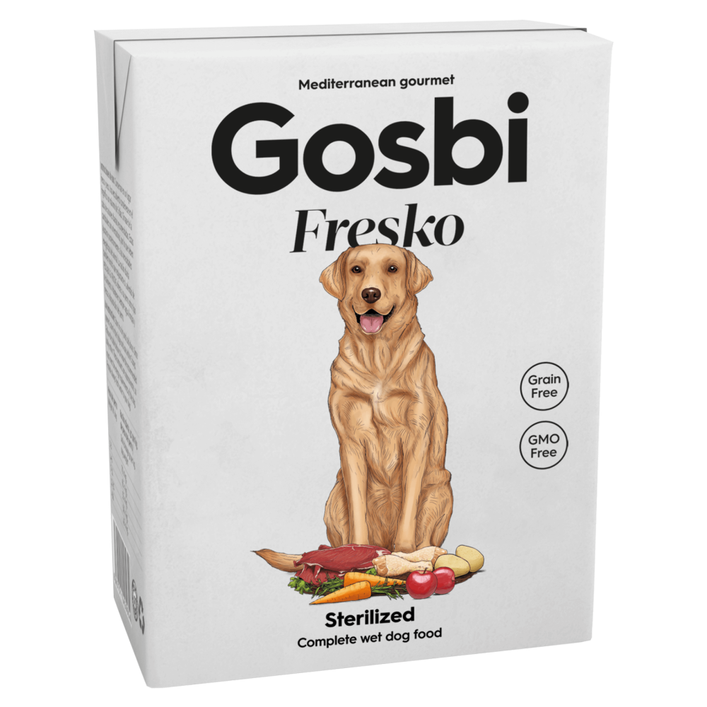 Gosbi FRESKO Sterilized es un alimento húmedo completo para perros esterilizados. Receta Grain Free y GMO Free, con textura suave y un perfil calórico ajustado para ayudar al mantenimiento del peso sin perder palatabilidad. Ideal para servir solo o mezclado con pienso. Formato: 375 g.